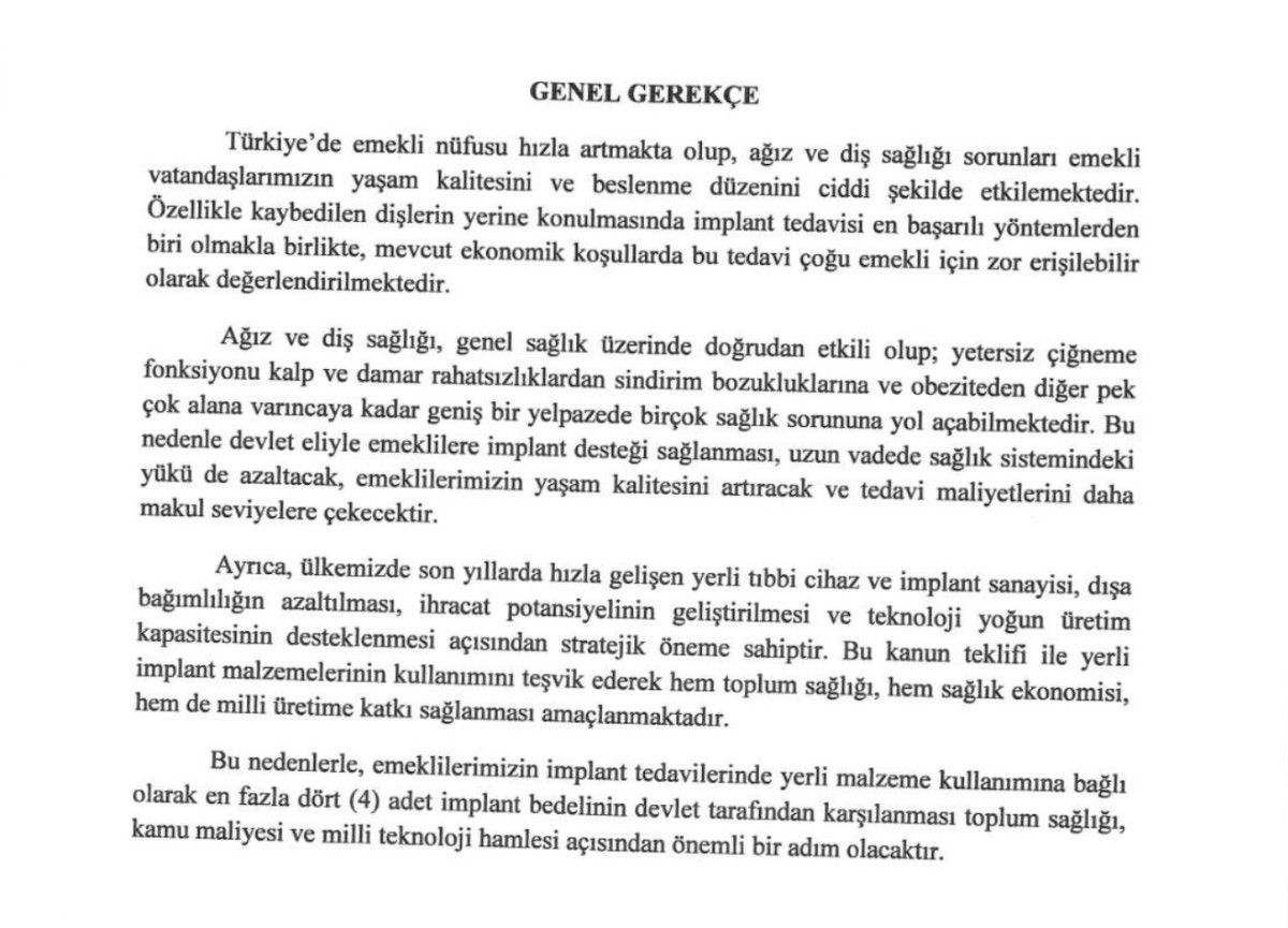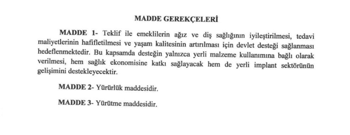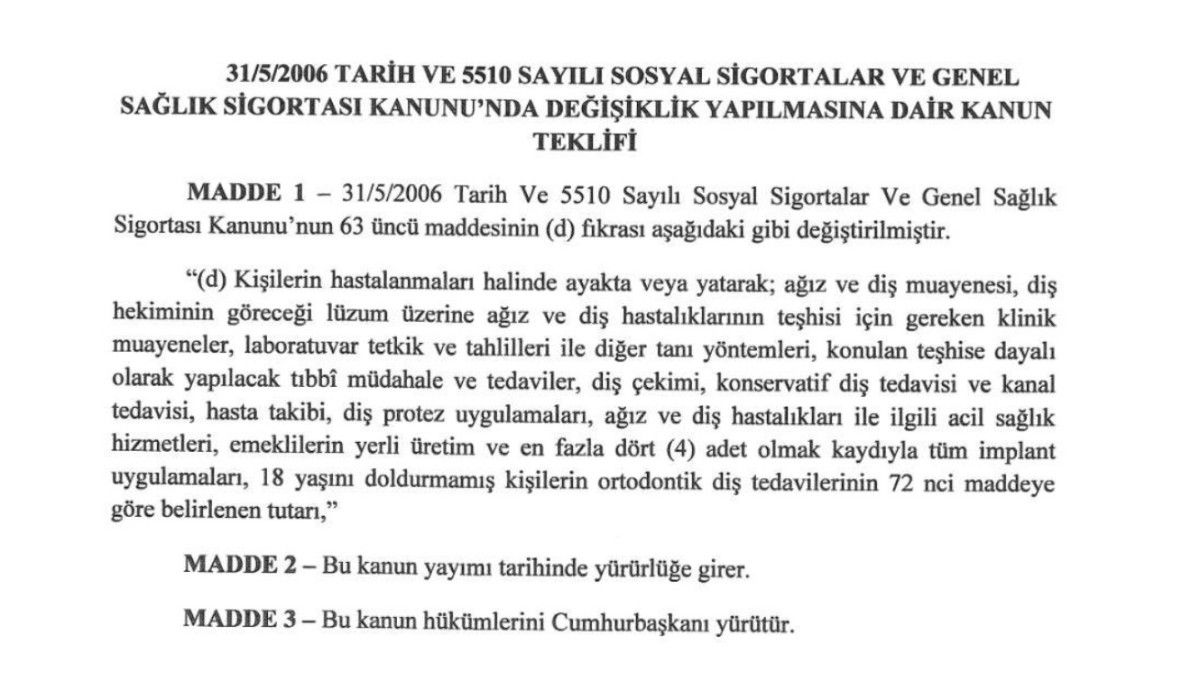 MHP Kayseri Milletvekili İsmail Özdemir’in sunduğu teklifle yerli üretim olmak şartı ile ve 4 adetten fazla olmamak üzere implant tedavilerinin SSK kapsamına alınması önerildi.