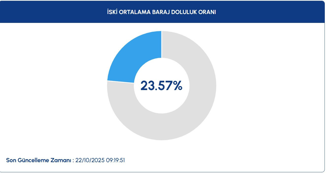 İstanbul’da meydana gelen yağışlar sonrasında İstanbul Su ve Kanalizasyon İdaresi (İSKİ) tarafından açıklanan son verilere göre, 22 Ekim itibariyle baraj doluluk oranı yüzde 23.57 olarak kaydedildi. Bu oran bir önceki güne göre hafif bir düşüş gösterdi. İstanbul’un su kaynaklarındaki durum her geçen gün yakından takip ediliyor.