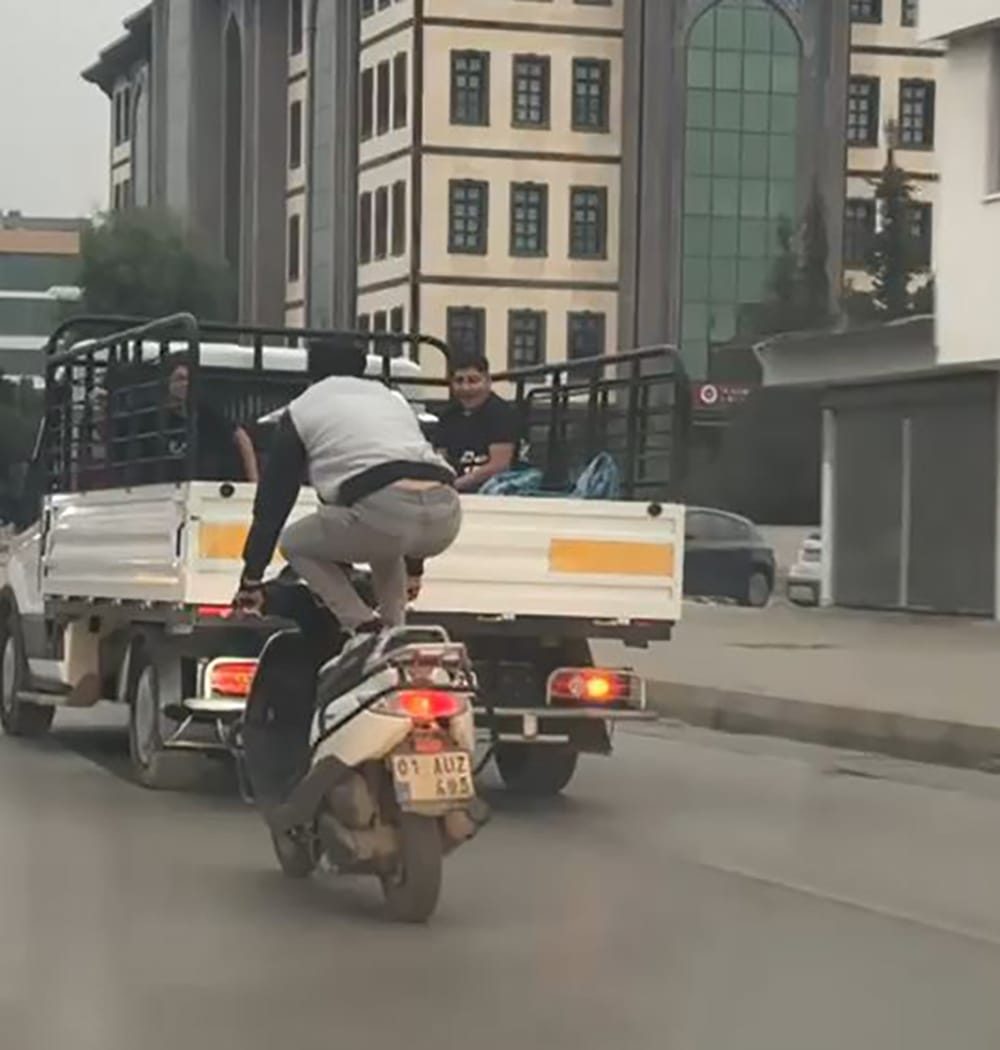 Adana’nın Seyhan ilçesinde seyir halinde olan bir motosiklet sürücüsünün yaptığı tehlikeli yolculuk yürekleri ağza getirdi.